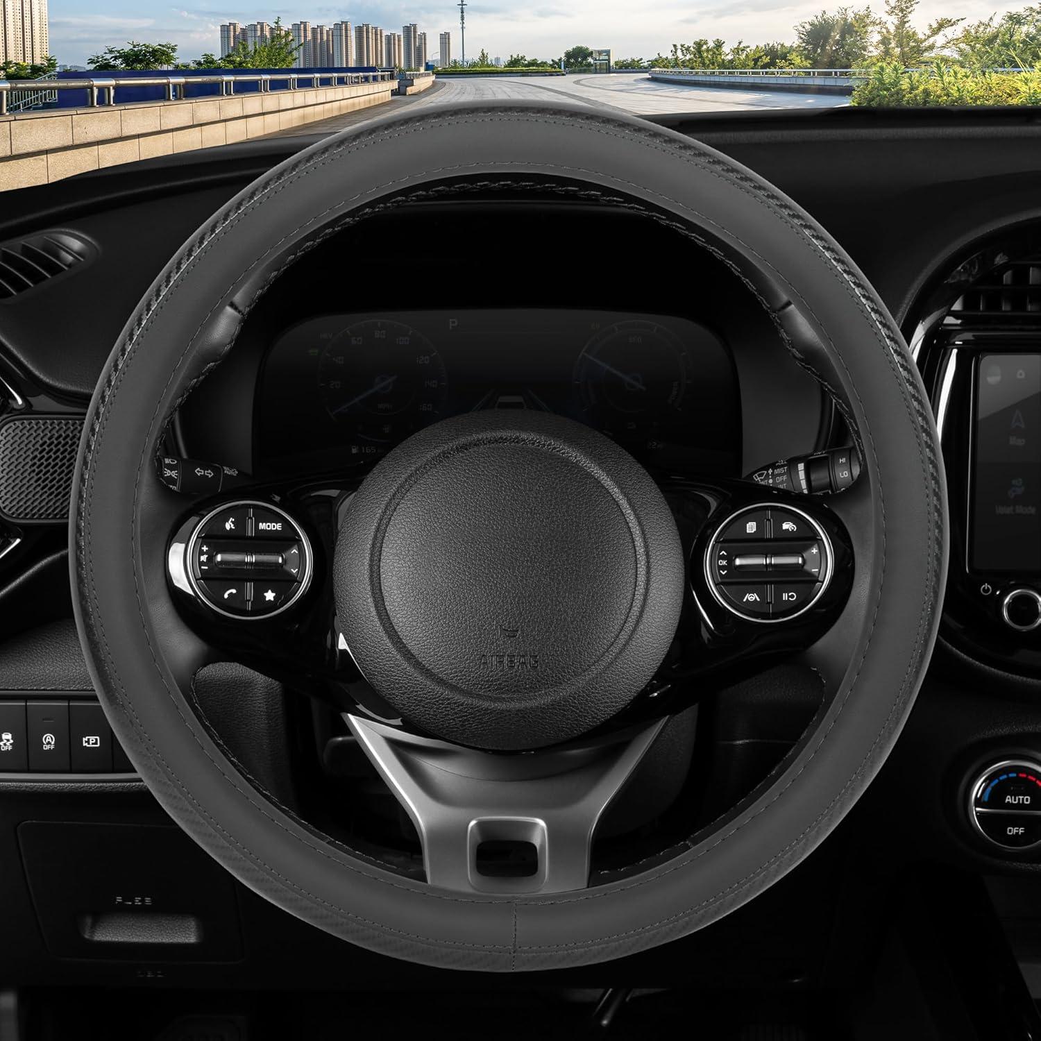 Elevate your driving experience with the Carbon Fiber Grip Steering Wheel Cover in a stylish charcoal gray and black color scheme. Designed to provide both comfort and functionality, this cover offers a secure and comfortable grip, allowing for precise control and a smoother drive. The carbon fiber pattern adds a touch of sophistication and modernity to your car's interior, enhancing its overall aesthetics. The non-slip inner lining ensures a secure fit, preventing any unwanted shifting or slipping during use. Crafted from premium quality materials, including carbon fiber-inspired fabric, this cover is highly durable, wear-resistant, and built to withstand daily use. Installing the cover is a breeze, thanks to its stretchable design and elastic band, which allows for easy installation on most standard-sized steering wheels without the need for any additional tools. Upgrade your steering wheel with the Carbon Fiber Grip Steering Wheel Cover for a stylish and comfortable driving experience.