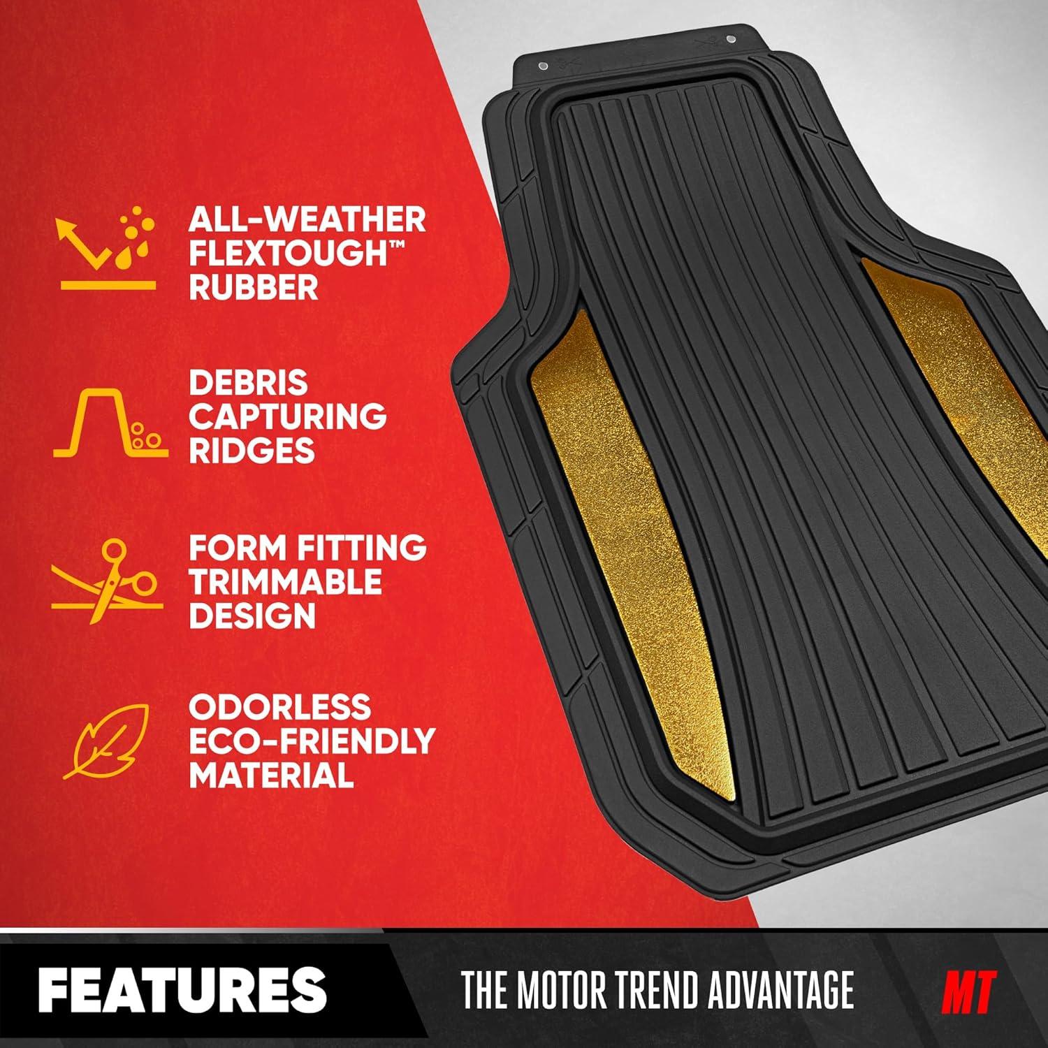 Motor Trend ChromeTech Car Floor Mats Full Set – Durable Rubber Floor Mats for Cars with Two Tone Accent, All Weather Interior Protection for Front and Rear with Non-Slip Backing, Silver Chrome(Black & Gold)