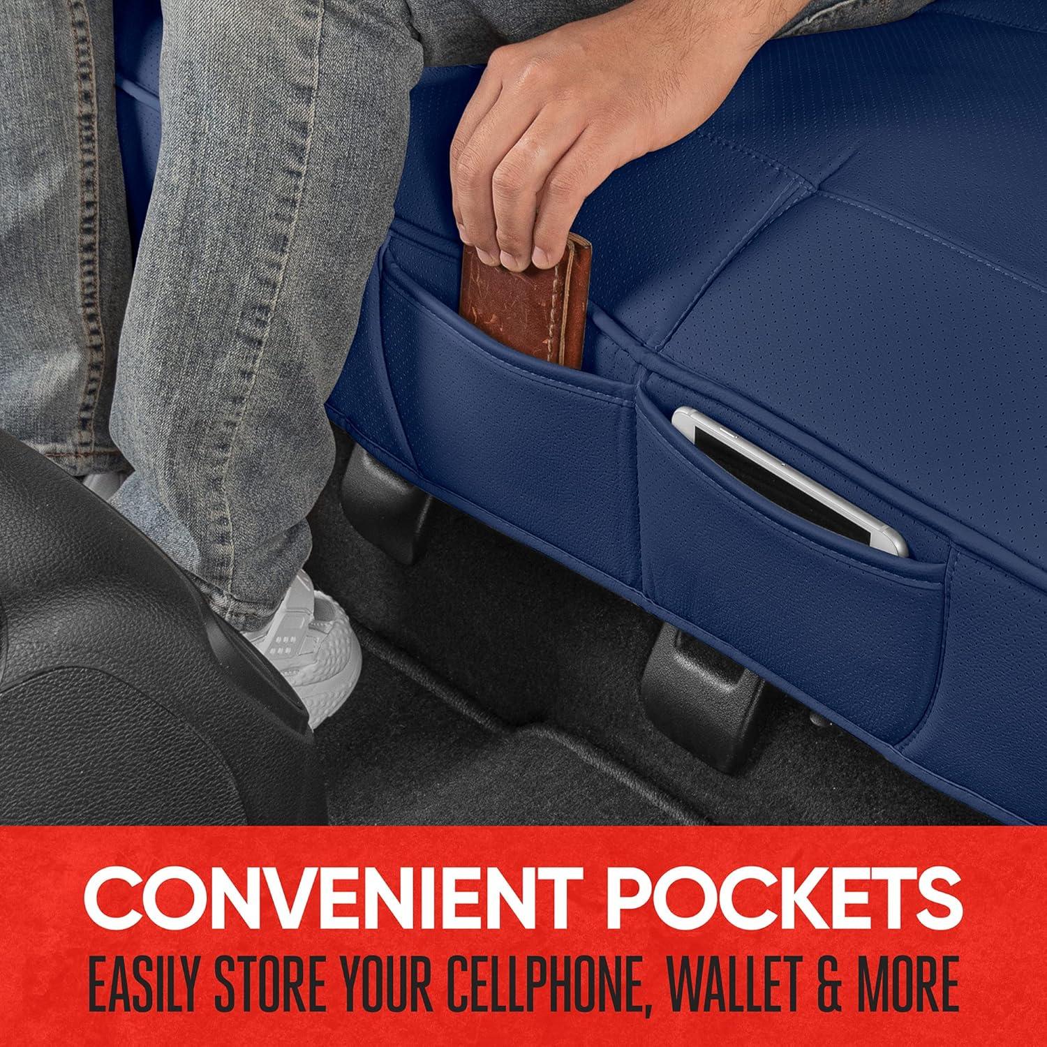 CONVENIENT FRONT POCKETS – Easily store your cellphone, wallet and more using the built-in front pocket. The stitched divider helps to keep your goods organized. Conveniently add some extra storage and protection to your car using these seat covers.