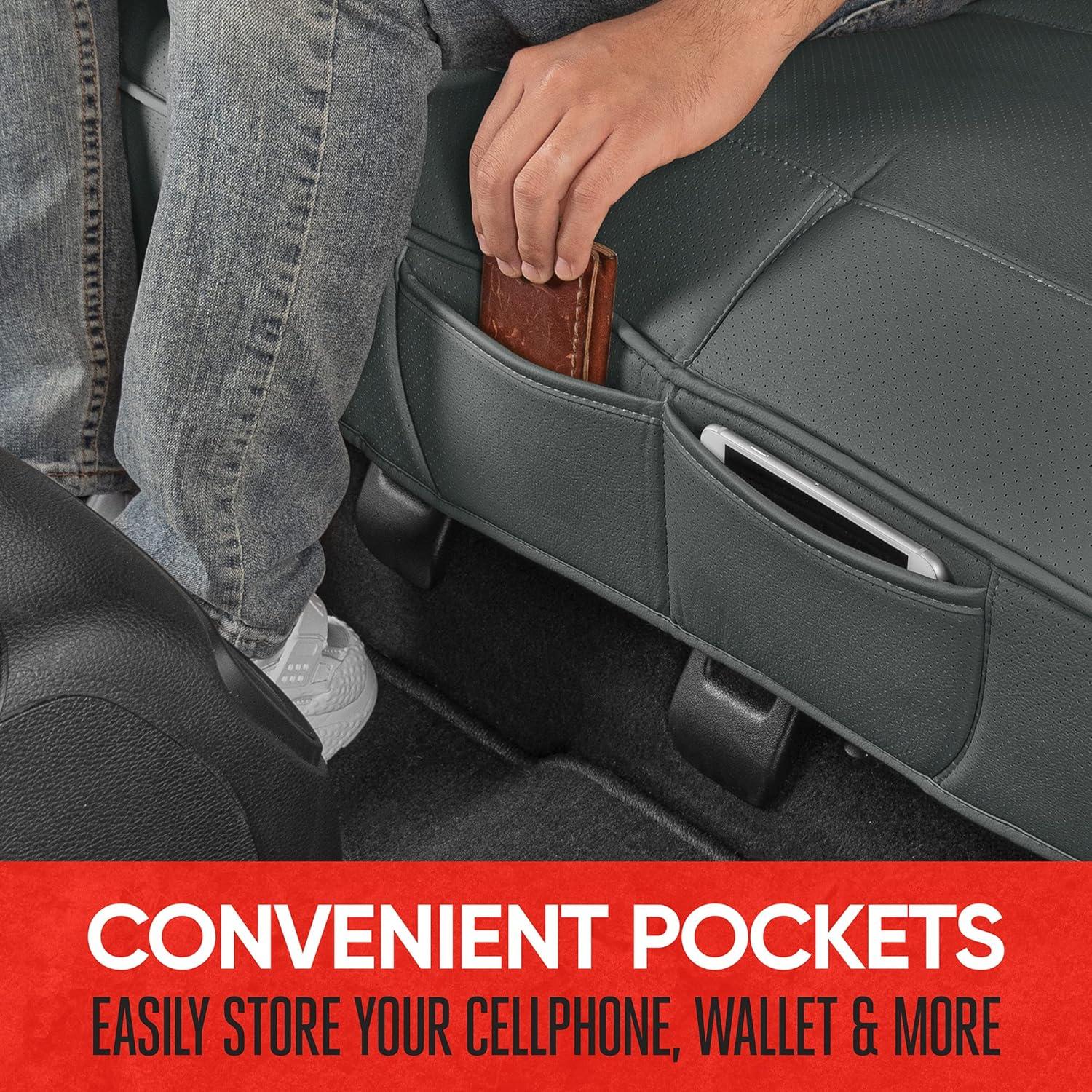 CONVENIENT FRONT POCKETS – Easily store your cellphone, wallet and more using the built-in front pocket. The stitched divider helps to keep your goods organized. Conveniently add some extra storage and protection to your car using these seat covers.