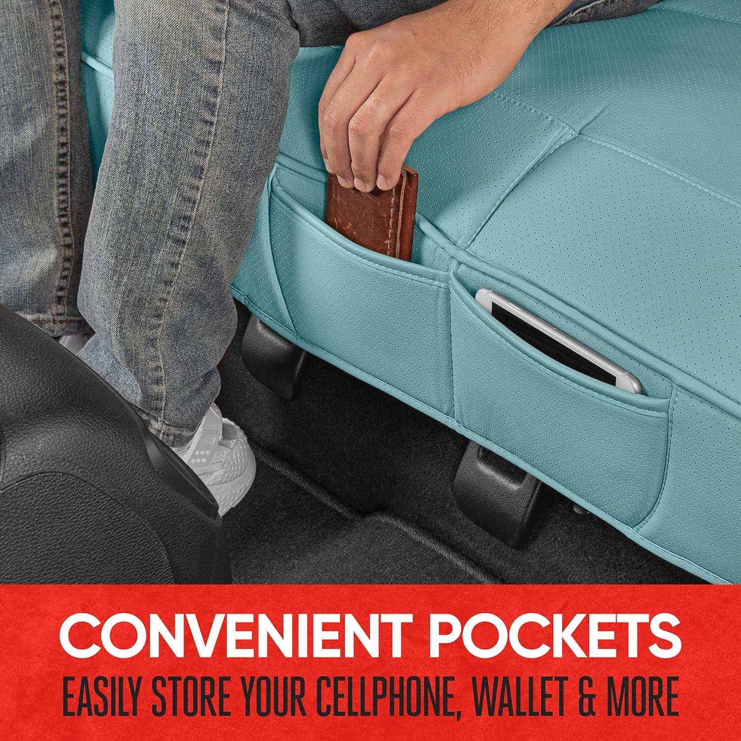 CONVENIENT FRONT POCKETS – Easily store your cellphone, wallet and more using the built-in front pocket. The stitched divider helps to keep your goods organized. Conveniently add some extra storage and protection to your car using these seat covers.