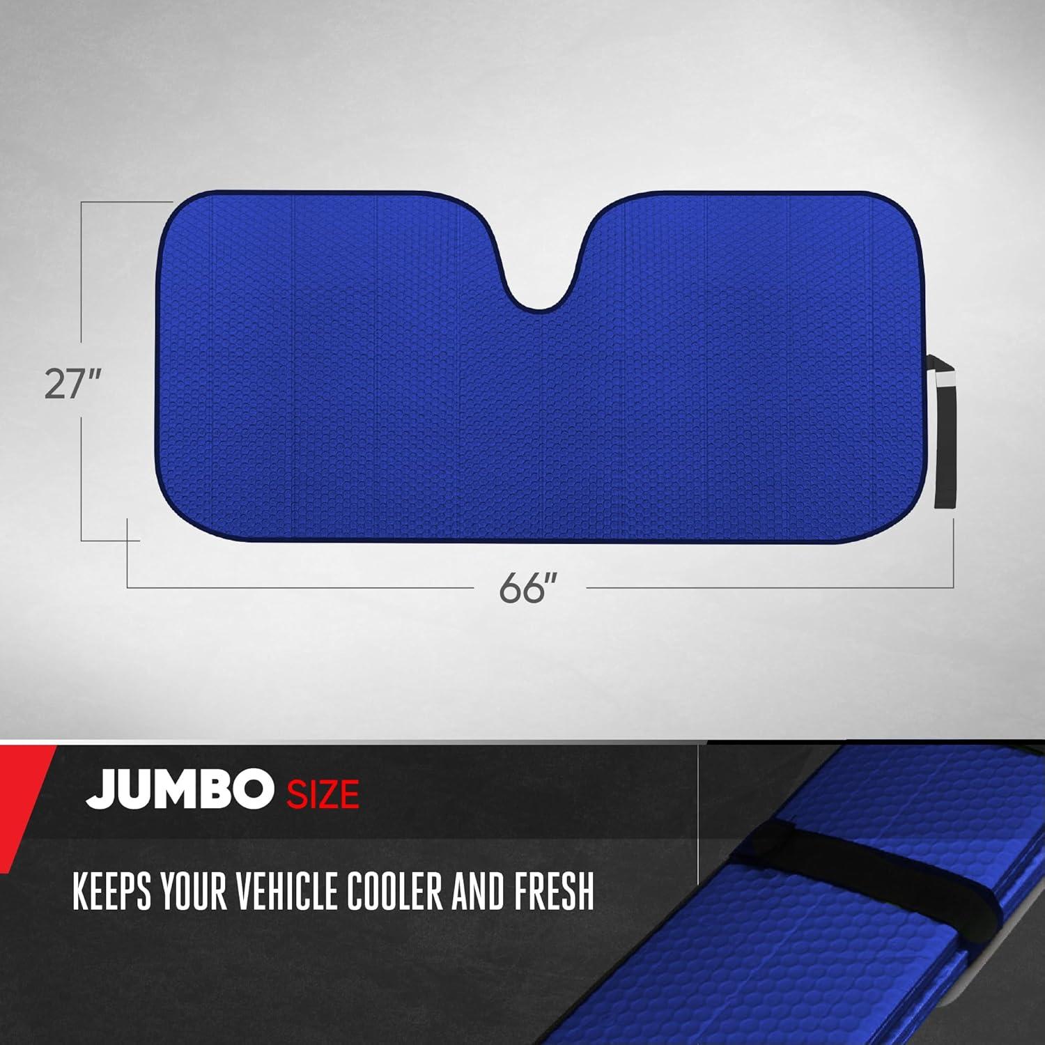 TOP QUALITY FITMENT: With a size of 58″ Width x 24″Height, this jumbo size accordion windshield cover sunshade was made to universally fit your car, truck, SUV or pickup. Universally made for most personal vehicles and fits the windshield using the rearview mirror as support. The tapered edges on this accordion car sun shade window cover will allow for a more snug fit.