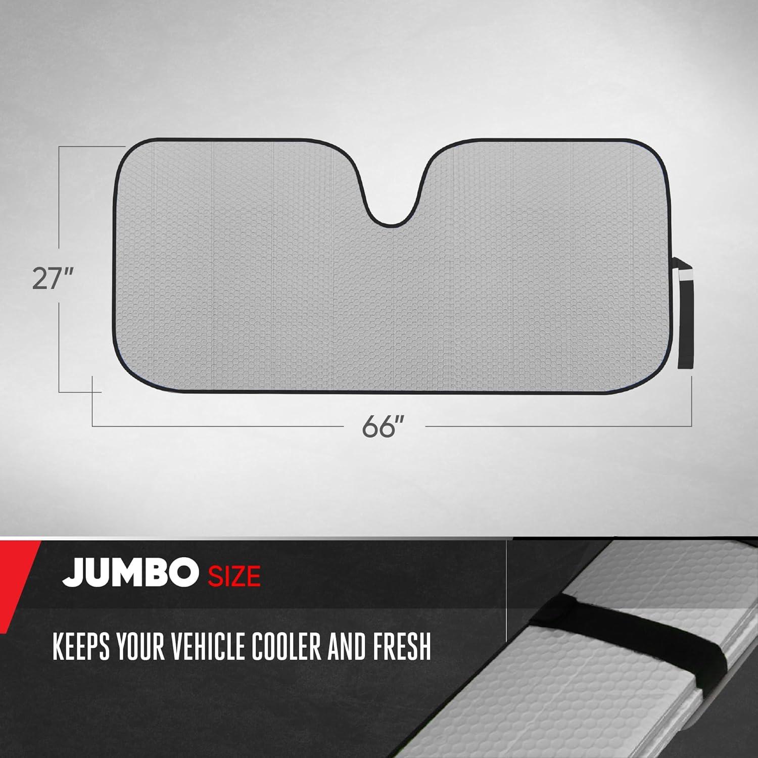 TOP QUALITY FITMENT: With a size of 58″ Width x 24″Height, this jumbo size accordion windshield cover sunshade was made to universally fit your car, truck, SUV or pickup. Universally made for most personal vehicles and fits the windshield using the rearview mirror as support. The tapered edges on this accordion car sun shade window cover will allow for a more snug fit.