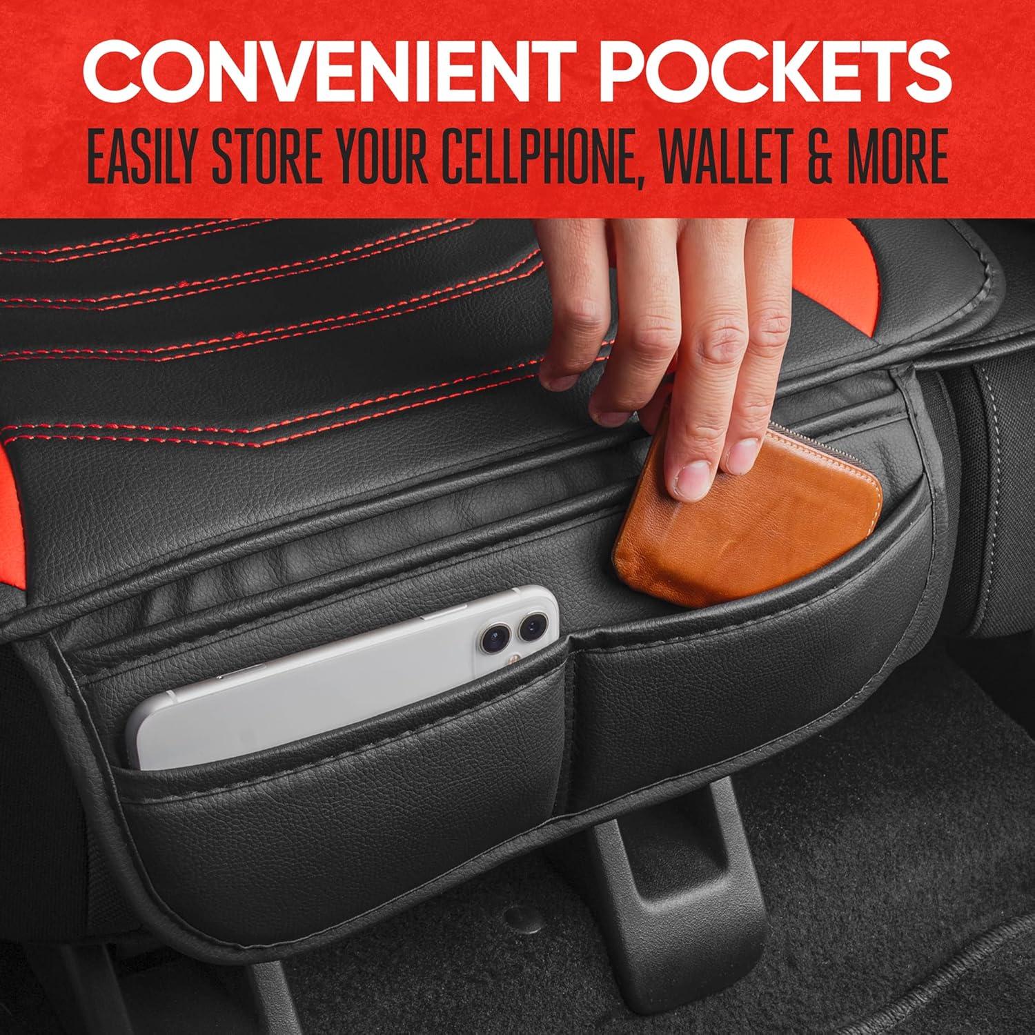 CONVENIENT FRONT POCKETS – Easily store your cellphone, wallet and more using the built-in front pocket. A stitched divider helps to keep your goods organized. You can conveniently add some extra storage and protection for your next trip using our faux leather front seat cover.