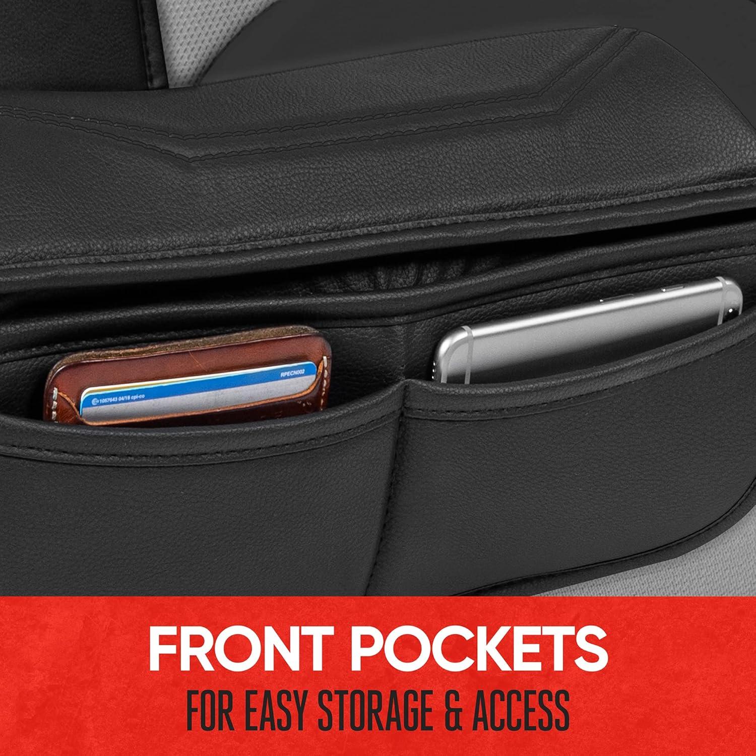 CONVENIENT FRONT POCKETS – Easily store your cellphone, wallet and more using the built-in front pocket. A stitched divider helps to keep your goods organized. You can conveniently add some extra storage and protection for your next trip using our faux leather front seat cover.