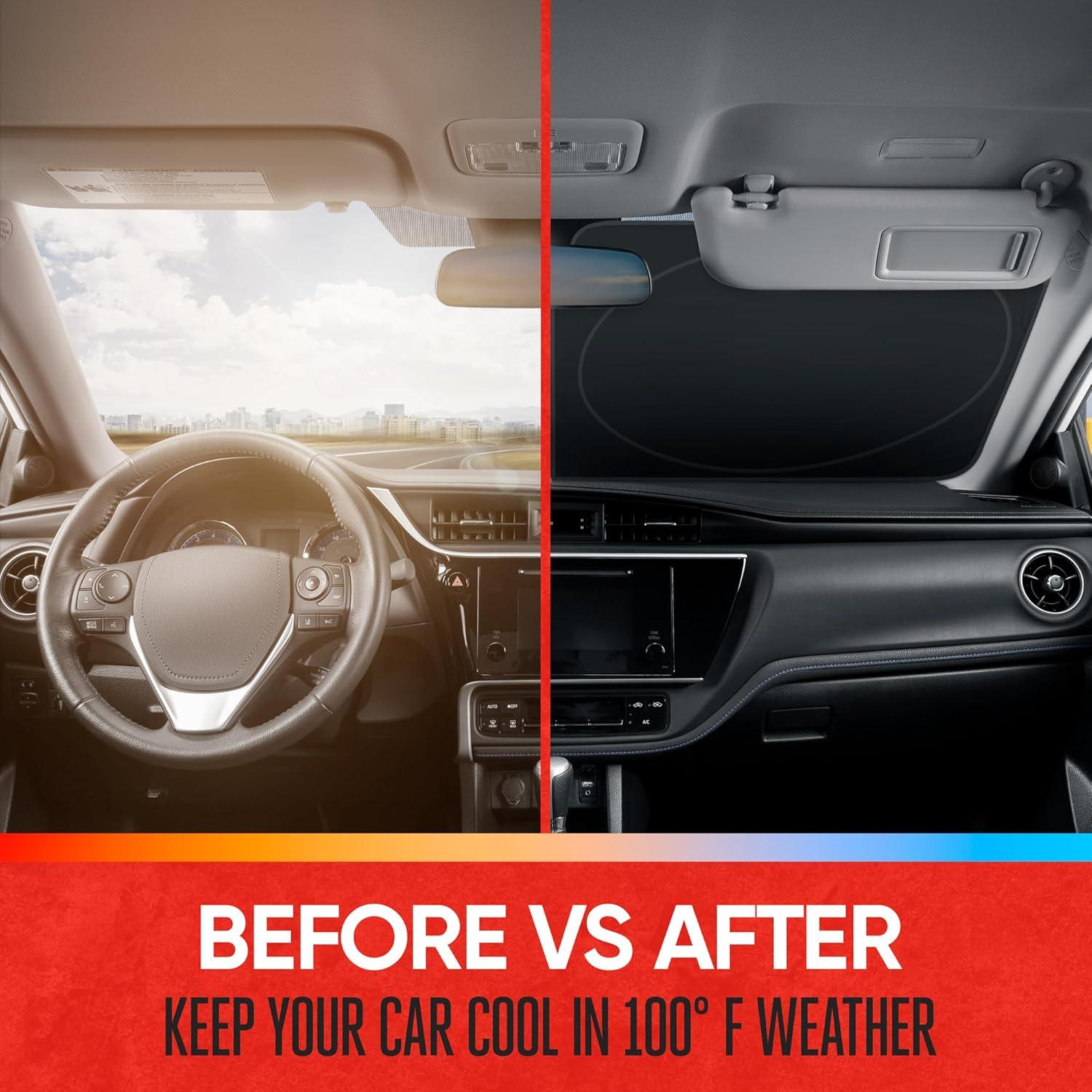 COMFORTABLE COOL INTERIOR – On a typical sunny day, avoid the extra heat and keep your interior cool with our top quality Windshield Sunshade Protector. Reduces interior car temperatures by 30-50 degrees. Blocks damaging UV rays; Keeps car cooler on sunny days.