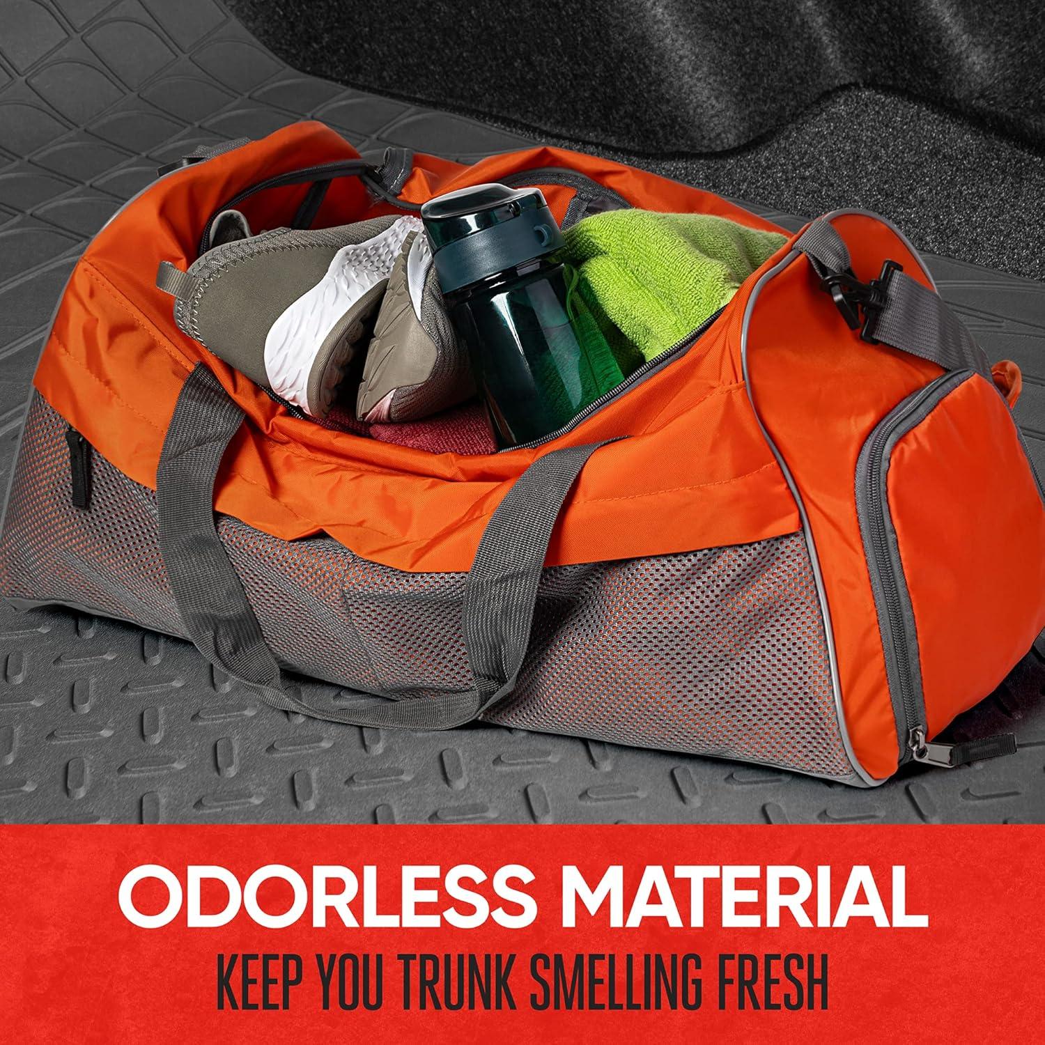 TRIMMABLE CAR & SUV CARGO LINER: This SUV trunk cargo mat is designed to easily fit the contours of your vehicle's floor using just a pair of scissors. Say goodbye to the hassle of forcing cargo mats into place—simply trim along the marked lines until you achieve a perfect fit. Cargo trunk liner rubber mat size 47.5″in x 32.2″in.